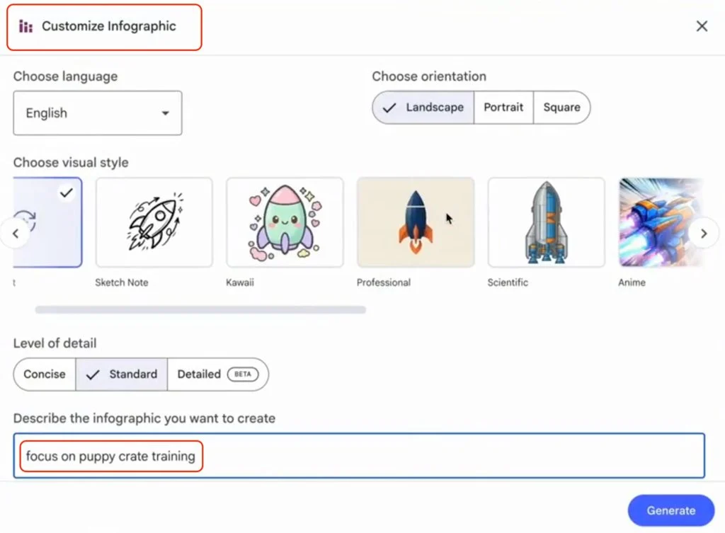 في نمط التصميم المخصص، يصف المستخدم نصًا حرًا ما يريده، على سبيل المثال، “رسوم بيانية بألوان الباستيل مع أيقونات بسيطة”، ويقوم النظام بإنشاء تصميم وفقًا لذلك. يُعد هذا خيارًا مفيدًا لمن يرغبون في تكييف المنتج مع هوية العلامة التجارية الحالية أو نمط تصميم محدد.